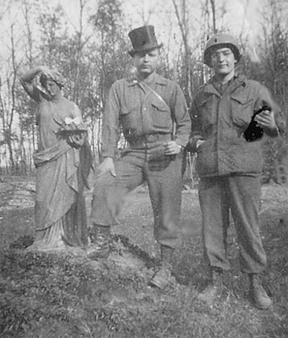I found this old photo of Lt Sherman and myself along with one of the local girls (good looking but very cold attitude) we met in Germany. This was taken after we left Cologne. I am holding a bottle of cognac that we had liberated (by the gallon) from a distillery. Sherman was not all correct, there were some lighter moments. By the way, that’s not a hole in my helmet and it does not match the holes in my head. Its just a blemish on the photo. (I think.)