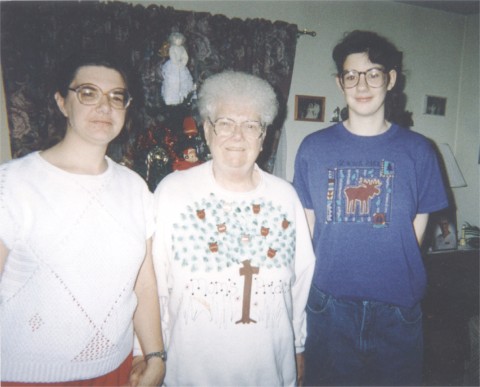 Here is a photograph of Myra Riley nee Wike, [center] daughter Anna Hogan [left] and granddaughter Renee [right] in front of Myra’s Christmas tree, at 25 E. Water St., Gettysburg, PA. Myra is wearing a Christmas gift of a sweat shirt with all her children’s names on each apple attached to the family tree. They are: Shirley, Polly, Elizabeth, Andrew, and Barbara. This photo was taken Christmas 2001, the last Christmas that Myra was with us.