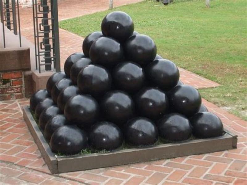 Also, bet you didn't know this!!!! In the heyday of sailing ships, all war ships and many freighters carried iron cannons. Those cannons fired round iron cannon balls. It was necessary to keep a good supply near the cannon, but how to prevent them from rolling about the deck? The best storage method devised was a square based pyramid with one ball on top, resting on four resting on nine, which rested on sixteen. Thus, a supply of 30 cannon balls could be stacked in a small area right next to the cannon. There was only one problem how to prevent the bottom layer from sliding or rolling from under the others.