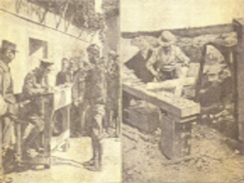 Left-Hand Picture shows British Officer in Macedonia issuing permits to natives to use roads. All travel being under military restrictions. Schoolhouse has been utilized as registration office. The teachers desk having been hauled out for the Officer to use. Right-Hand Picture shows British soldier behind Somme Front in France making wooden crosses to mark graves of the dead. French Government says that graveyards will be permanently preserved.