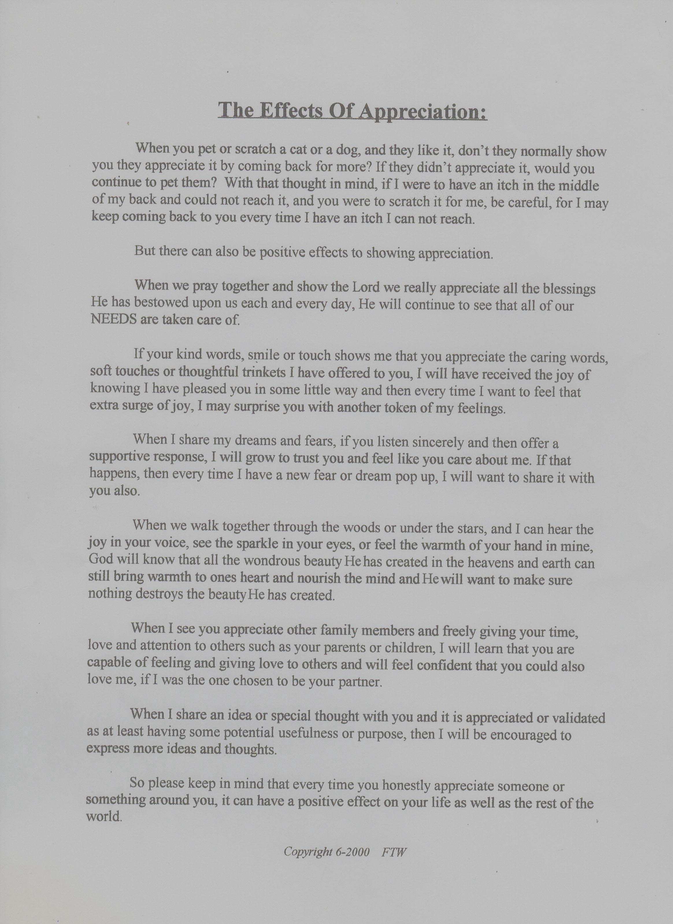 This "Effects Of Appreciation" Writing of Love is appropriate to copy, print and share FREE with anyone that you feel would be inspired by it.