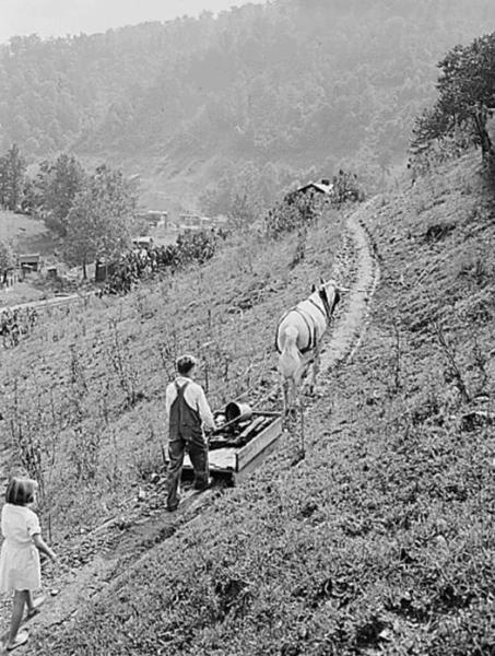 Franklin D. Sergent sledding home household coal from the mine. The company charges $2.80 monthly for household coal, designating certain coal which the miners may haul away themselves; if the company does the hauling a charge of $1.50 per ton is made for haulage. P V & K Coal Company, Clover Gap Mine, Lejunior, Harlan County, Kentucky., September 12, 1946...
