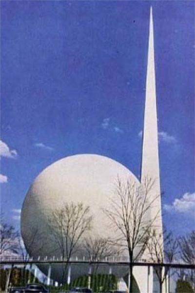 The Trylon and Perisphere, represented the World of Tomorrow theme of the 1939 New York Worlds Fair. The Trylon, a triangular tower, measured 610 feet high, and the Perisphere, a globe, measured 180 feet in diameter.