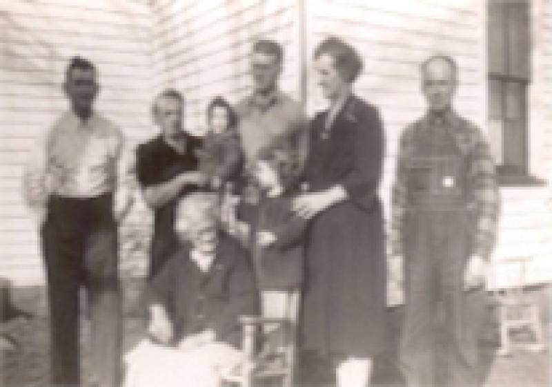 Picture, from left to right: Chris Smith, Carrie Smith nee Hasenmyer holding John Held, Harold Held, Alice De Luca nee Held standing in rocker, Ida Parker nee Hasenmyer supporting Alice, and Fred Parker. Magdelina Hasenmyer nee Kebortz is sitting in the rocker.