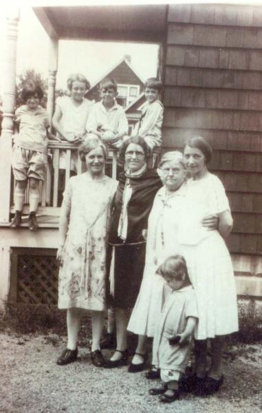 Frances Hinkelbein Batho, Jane Crouch, Bob Thayer, Jim Thayer, May Crouch, Gertrude Batho, Grandma Hinkelbein, Edna Thayer, and Ray Thayer.